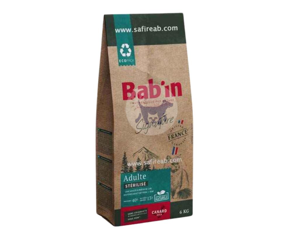 بروتين البط المجفف (18%)، بروتين الذرة، بروتين الدجاج المجفف (16%)، الذرة، دهون البط، أرز كامارغ الأبيض، محلول بروتيني حيواني (5%)، القمح، لجنين السليلوز (3%)، خميرة البيرة (1%)