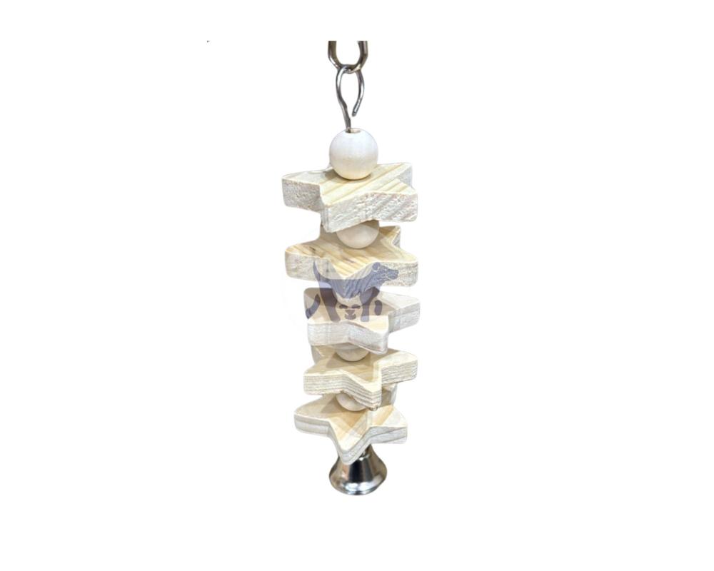 - لعبة طيور مصنوعة من الخشب على شكل نجوم وكرات، مع جرس في الأسفل وحلقة تعليق في الأعلى.