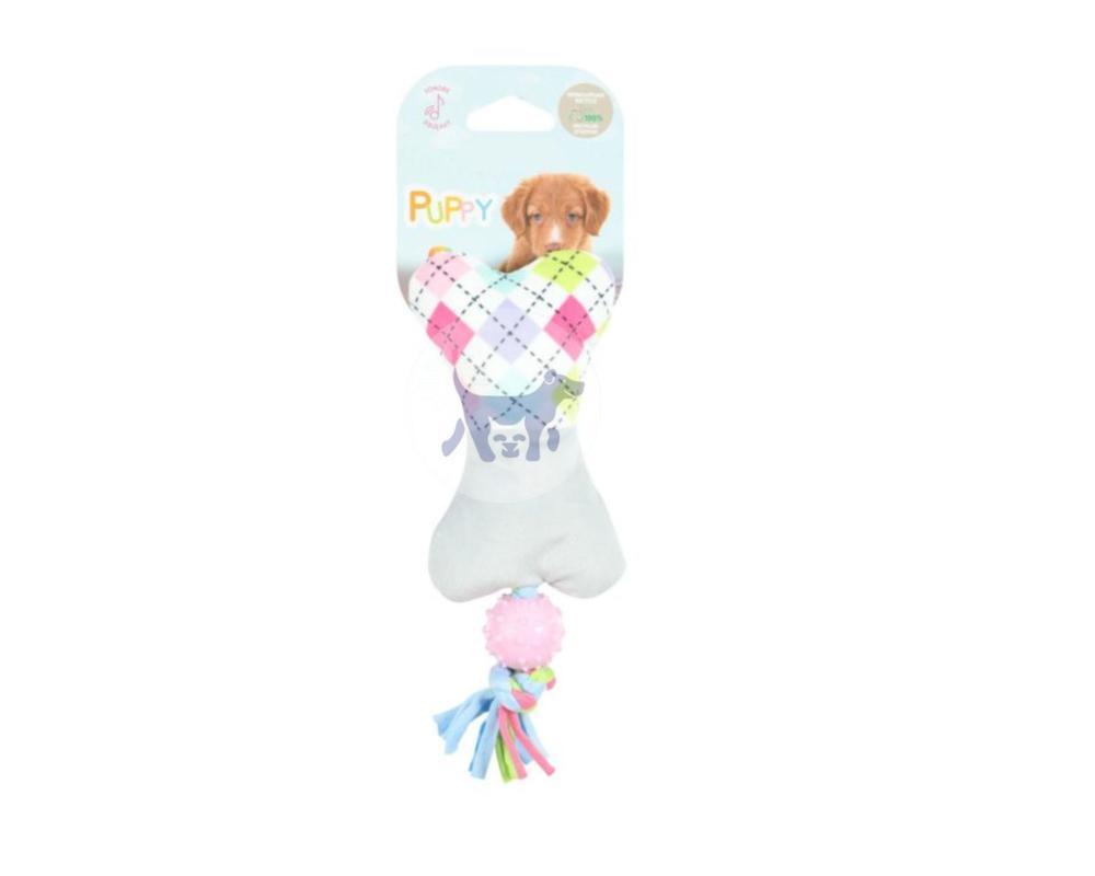لعبة للجراء على شكل عظمة من القطيفة.لعبة مناسبة بشكل خاص للجراء والكلاب .تأخذ اللعبة شكل العظم وتحتوي على كرة (مطاط حراري بلاستيكي).تحوي حشوة بوليستر معاد تدويرها بنسبة 100%.